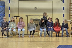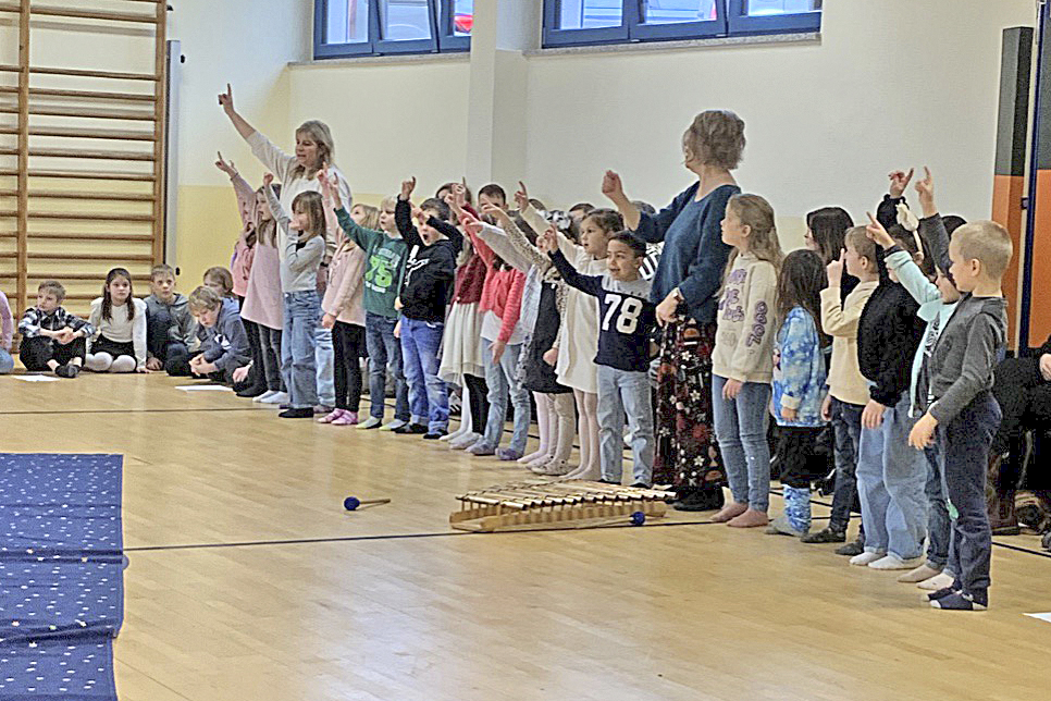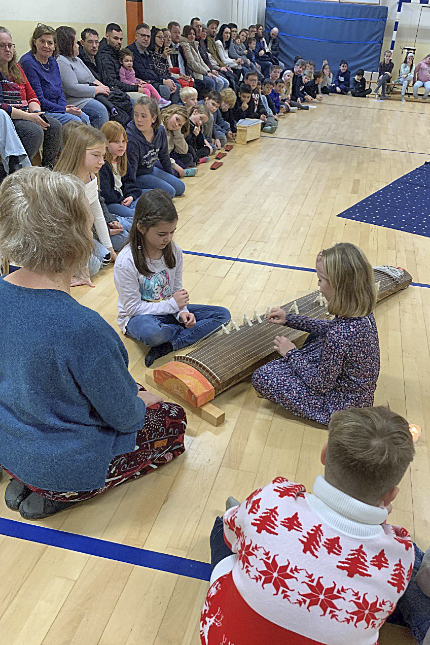 Die Klasse 2a präsentiert mit dem Lied japanischen „Takibi“ einen ganz besonderen winterlichen Gruß aus dem fernen Osten. Dabei erklären zwei Kinder wie bei der Sendung mit der Maus nach dem Vortrag der Klasse in der fremden Sprache zunächst: „Das war japanisch“ und singen dann mit der Klasse zusammen die schöne deutsche Übersetzung. Im Anschluss zeigen wiederum zwei Kinderpaare, wie die japanische Koto, eine liegende gewölbte Harfe klingt. Sie spielen „Sternenmusik“.