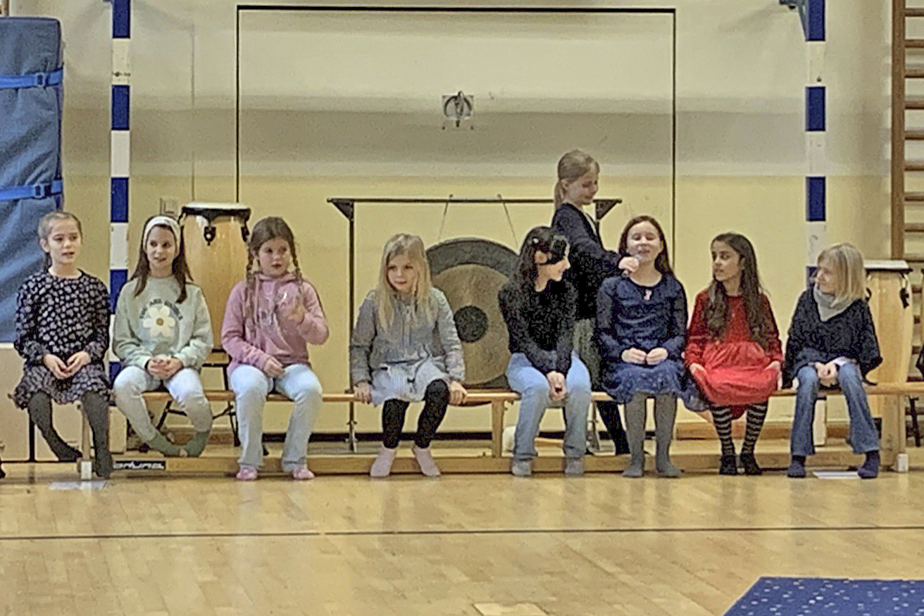 In der Klasse 3 spielt die Auseinandersetzung mit Märchen und Lügengeschichten, neudeutsch auch „Fakes“ genannt, eine wichtige Rolle. Übernehmen doch immer mehr Falschbehauptungen und angstmachende Lügengeschichten die sozialen Medien und die elektronische und reale Welt, in die sie hineinwachsen. In einer teils sehr witzigen szenischen Annäherung wandert die Klasse also vom Erzählen ihrer Lieblingsmärchen, von selbst erdachten und geschriebenen Geschichten über die Münchhausen-Erzählung vom „Pferd am Kirchdach“ zu Lügensätzen wie „Weiße Hühner legen weiße Eier…, braune Hühner legen braune Eier“ und schließlich zu TikTok-Behauptungen über Vogelspinnen, die sich im Kinderbett einfinden, wenn man die Seite nicht weiter abonniert oder liked. In der Schlussszene ihrer Aufführung gibt sich die Klasse dann ratlos: „ Wie kann man denn falsch und richtig unterscheiden?“ und fragt im Publikum nach: „Liebe Eltern! Könnt Ihr uns vielleicht helfen?