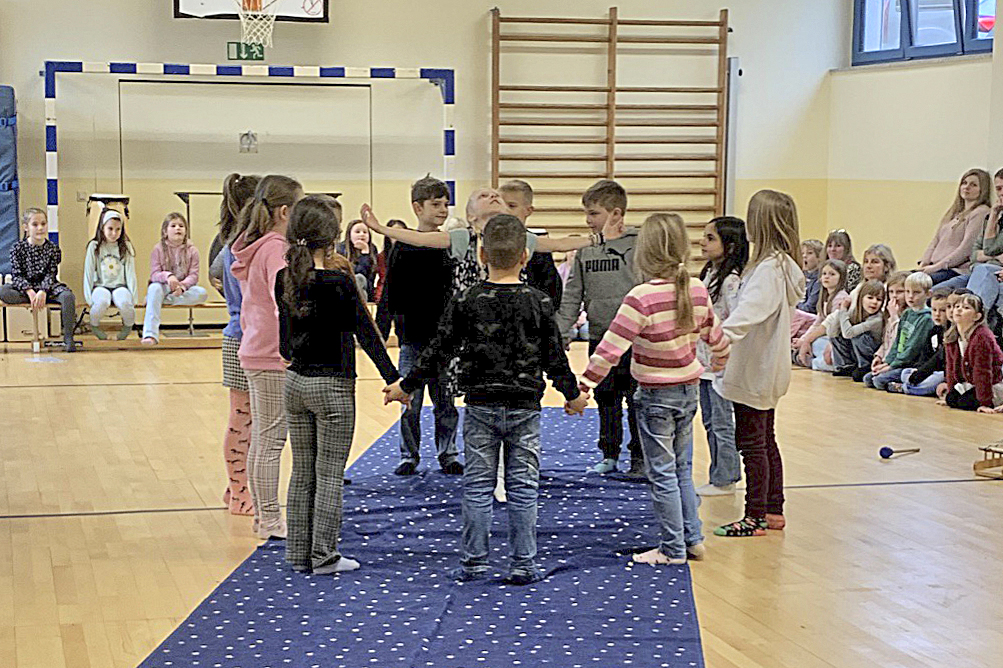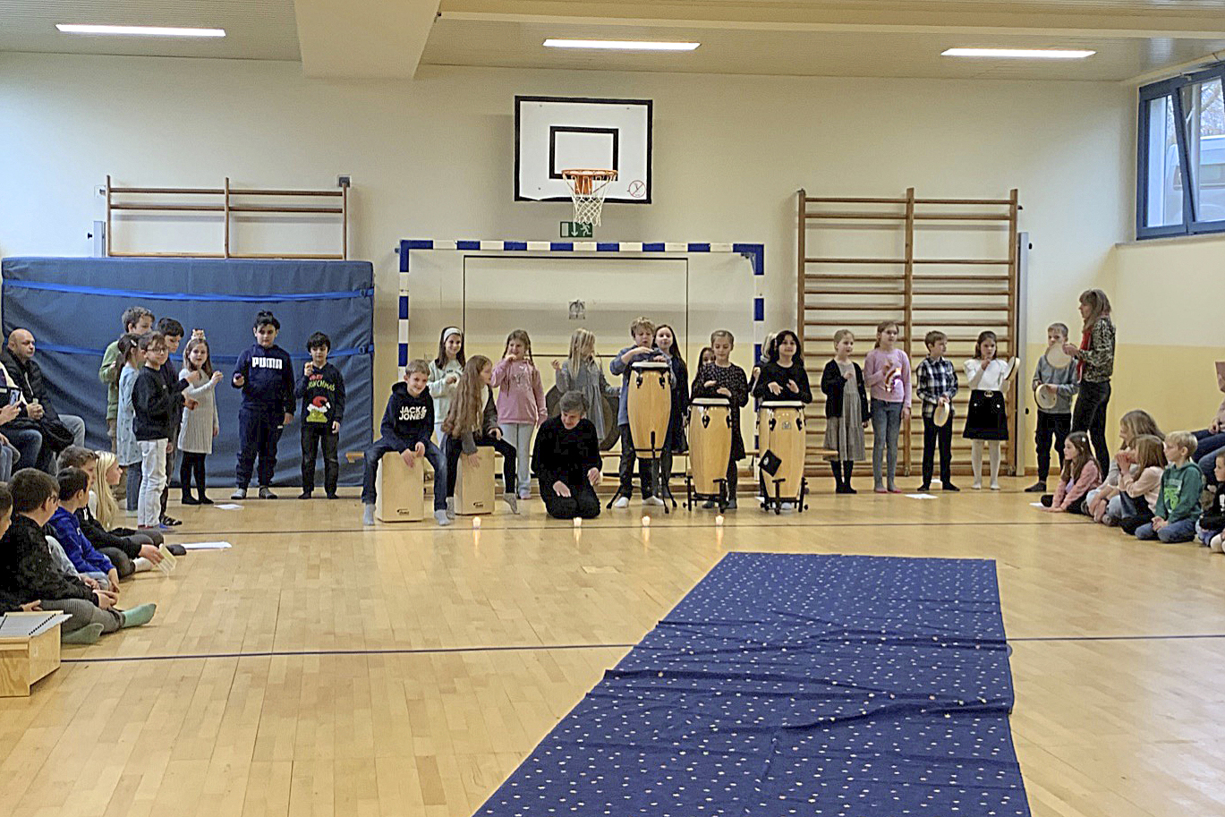 Mit einem szenischen Spiel auf einem großen Sternentuch, Liedern und Musik zeigen die Klassen 2b und 1 das Märchen „Sterntaler“. Dabei wird die Geschichte von drei Kindern der Klasse 2 mit viel Selbstbewusstsein sehr schön gelesen. Alle anderen Kinder der Klasse sind szenisch eingebunden.